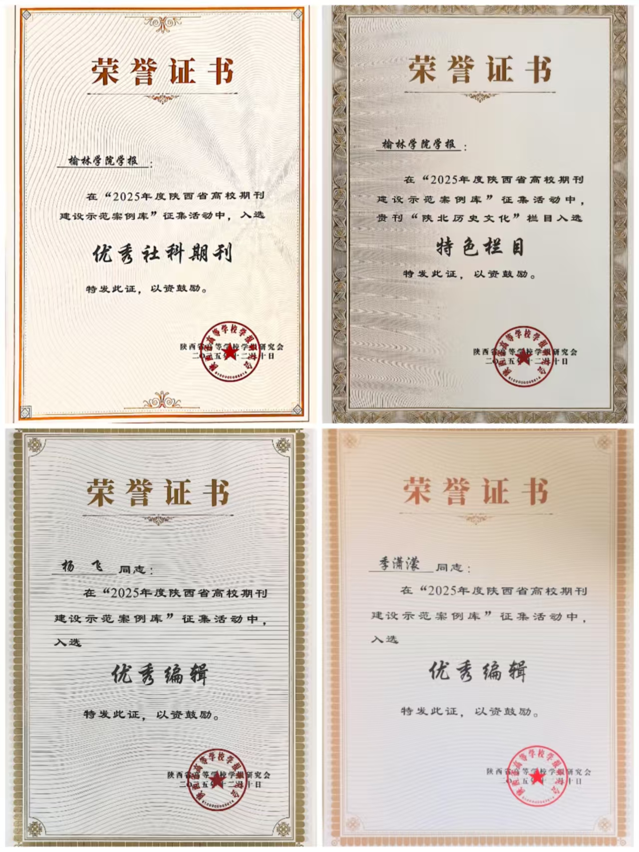 2025年12月10日至12日,陕西省高等学校学报研究会理事会议暨2025年秋季学术年会在陕西杨凌召开。会议公布了陕西省高校期刊建设及编辑培育优秀案例评选结果,《榆林学院学报》入选“2025年度陕西省高校期刊建设示范案例库•社科期刊案例•优秀期刊”;“陕北历史文化研究”专栏获评“2025年度陕西省高校期刊建设示范案例库•社科期刊•特色栏目”;编辑杨飞、季潇濛获“优秀编辑”称号。